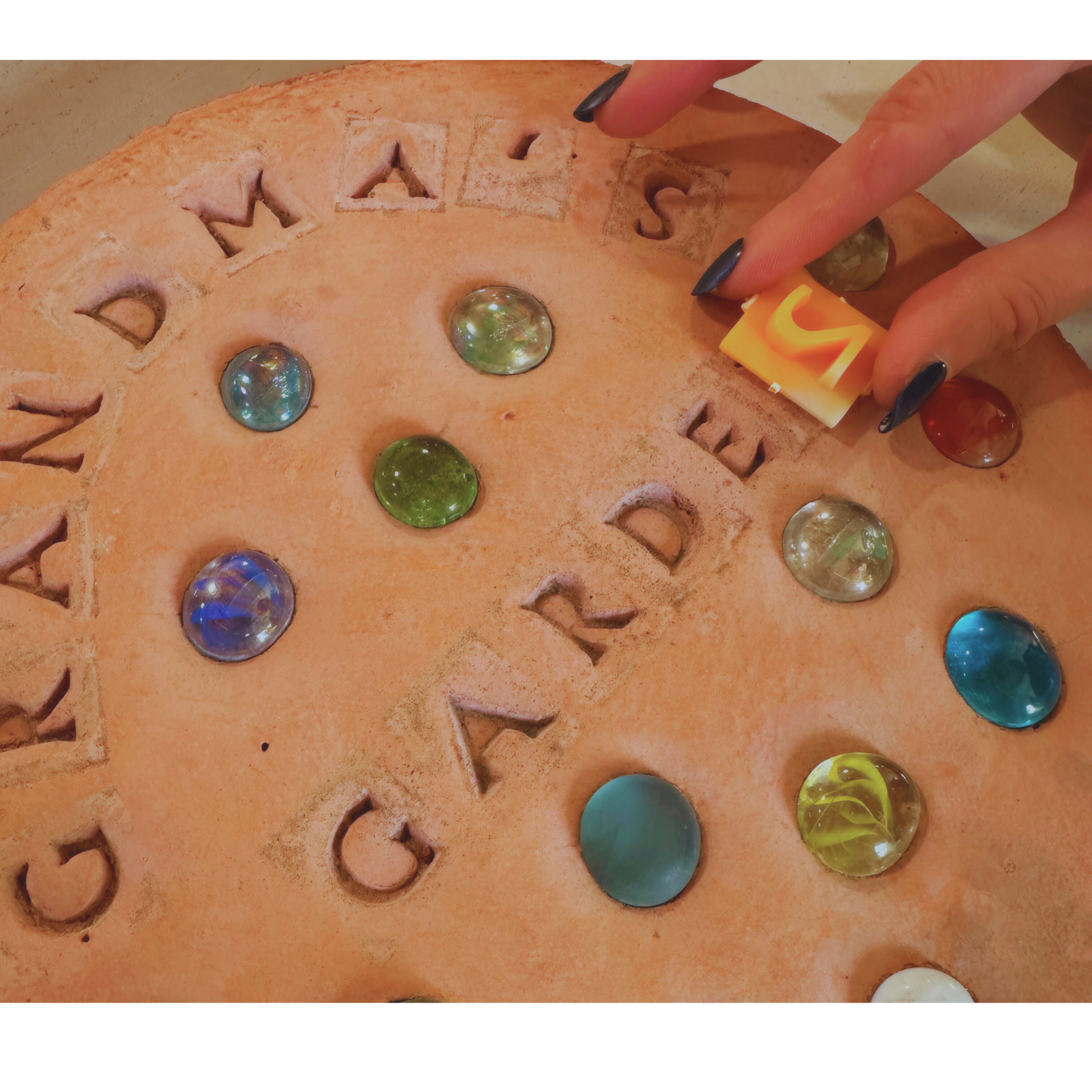 **Stone Stamps are an add on option. They are double sided, alpha-numeric, plastic, and reusable. The stamps were used on the stepping stones in the photos.