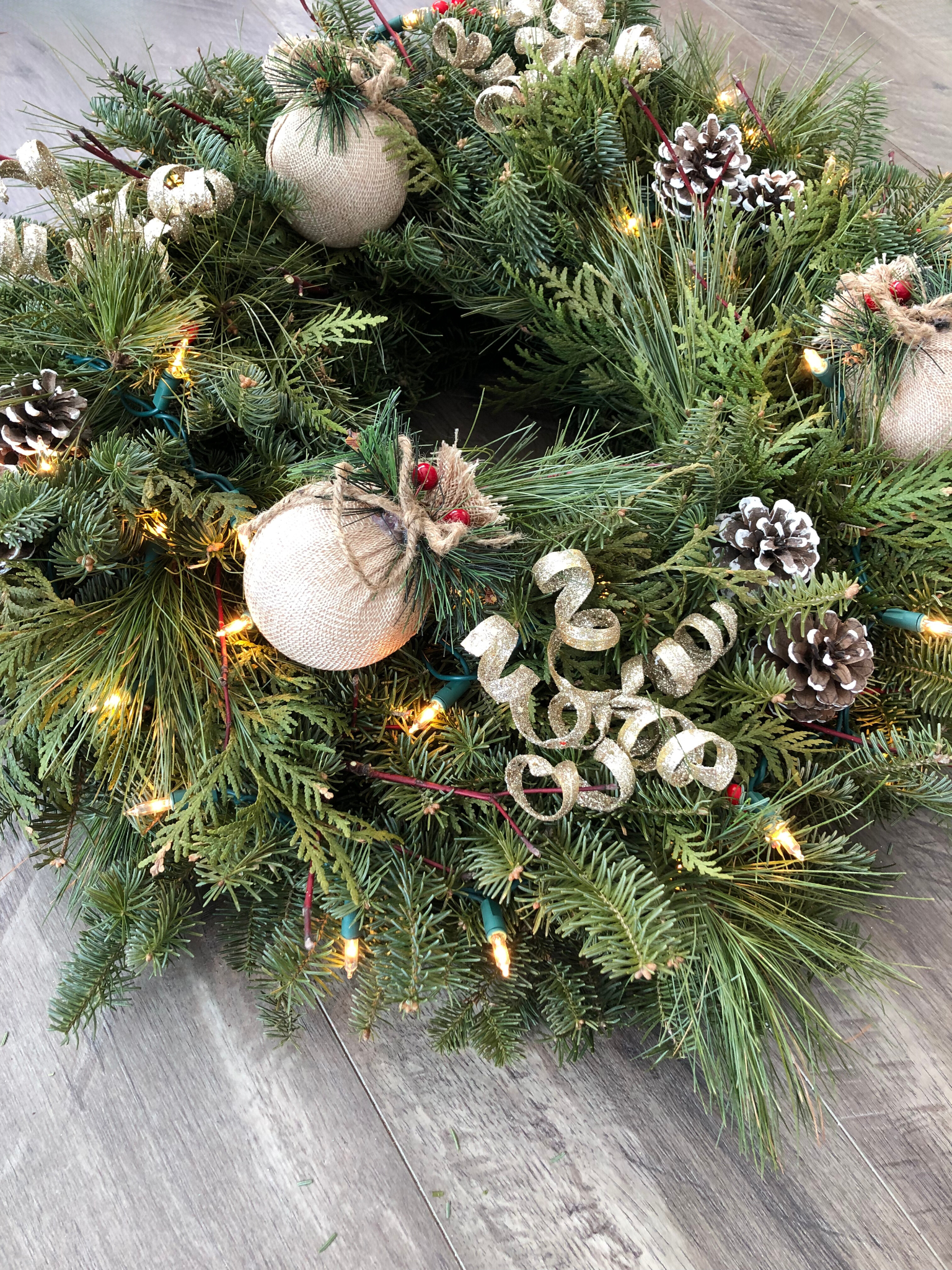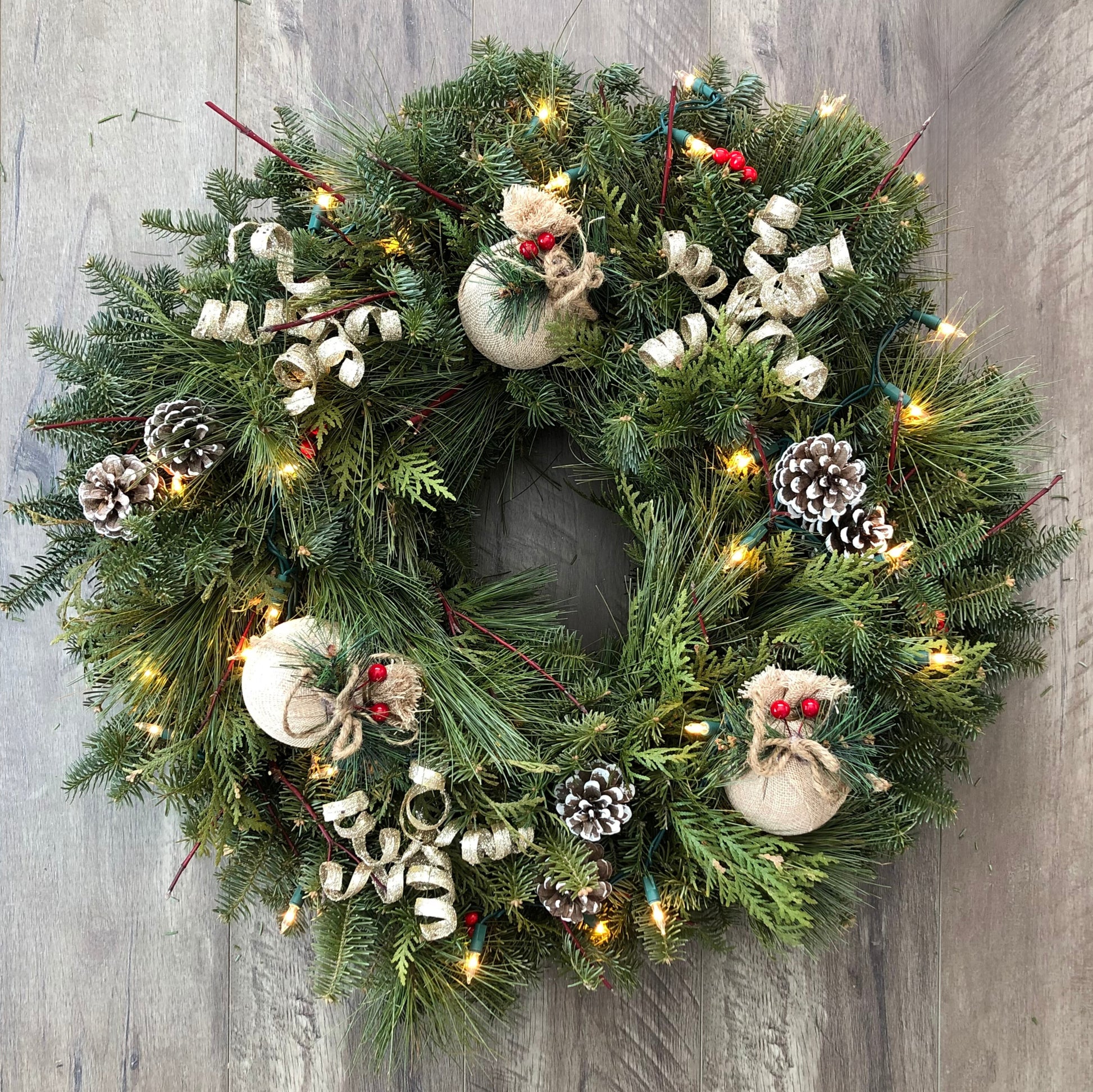 This elegant handcrafted wreath is made using a mix of freshly cut pines including balsam, cedar, and white pine with a touch of red dogwood. Adorned with burlap bulbs, glittery twirls, and white tipped pinecones.